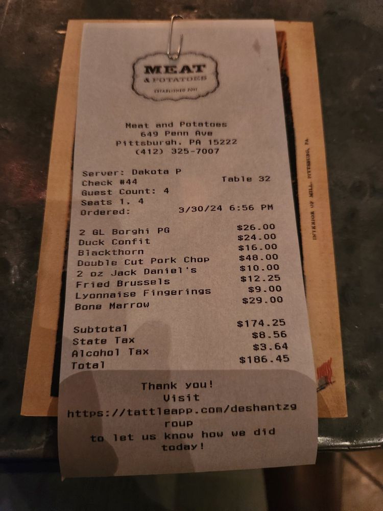 Welcome to Meat & Potatoes, a New American Gastropub located in Pittsburgh, PA. This trendy spot offers a variety of options for diners, including Pescatarian, Vegan, and Limited Vegetarian dishes. The restaurant provides a cozy ambiance with a speak-easy vibe and prompt, friendly service.
